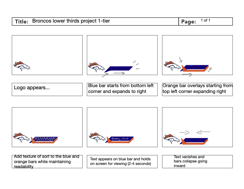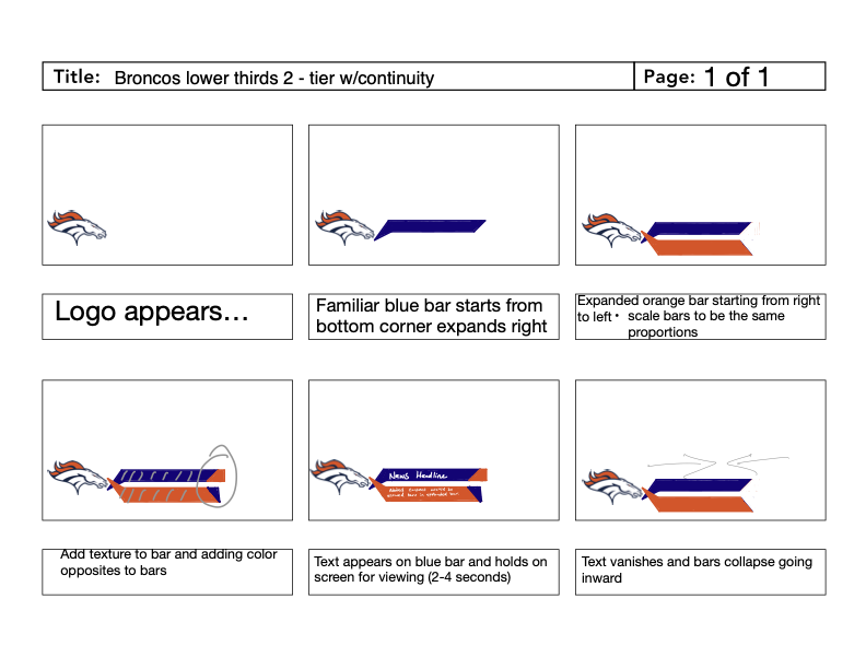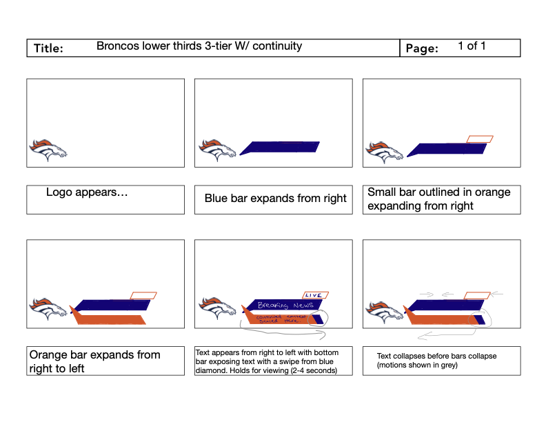 Using brand assets from the official NFL Broncos brand guide, developed a lower thirds bumper in Adobe After Effects. Created shapes and styled with official colors and typography, and added animation and effects.